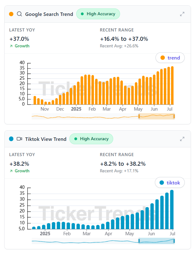 Social signals like TikTok hashtag interaction volume and Google Search showing strong year-over-year acceleration