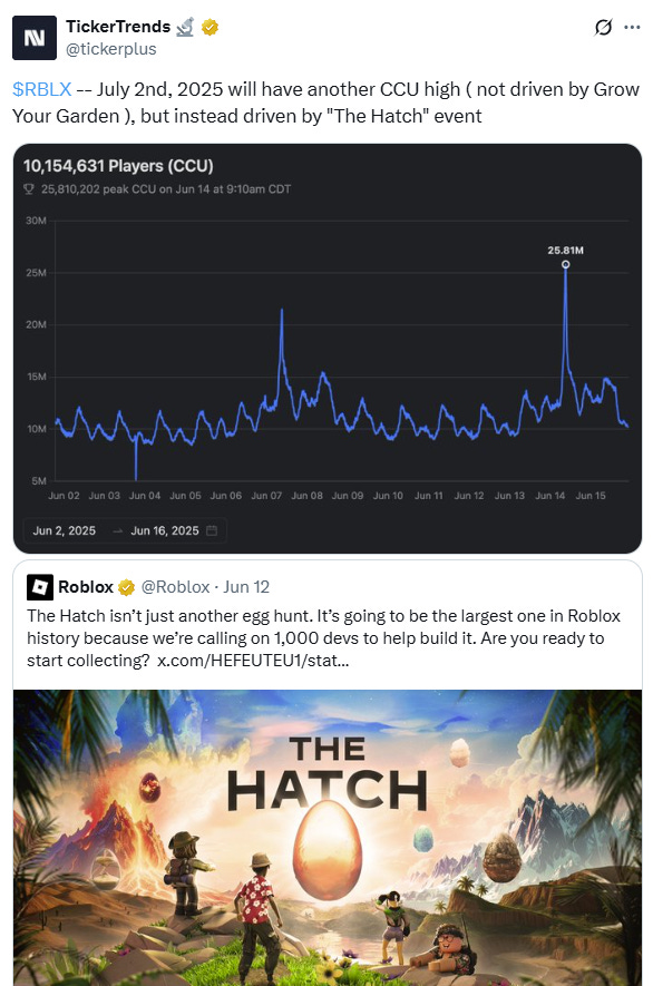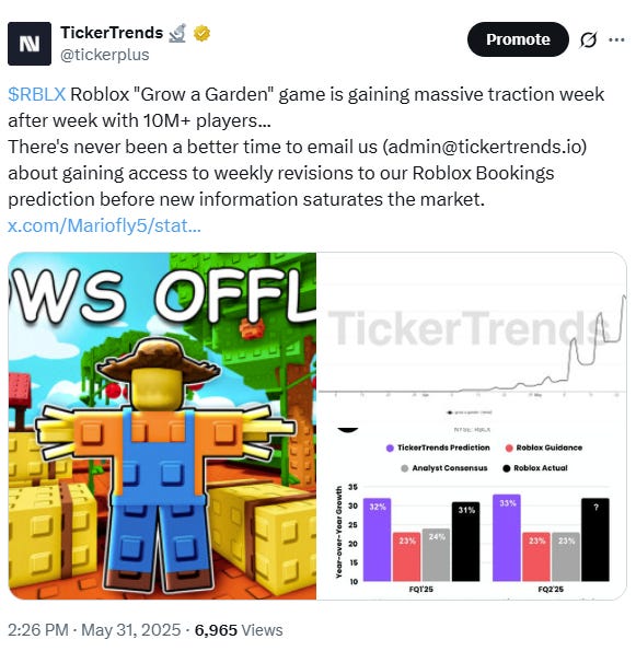 On May 29, we tweeted a bold KPI forecast for Roblox bookings growth. Our projection clearly outran the company’s guidance and Wall Street consensus at the time. In our graphic, we showed TickerTrends prediction at 33% YoY growth, compared to Roblox’s guidance of 23% and the Wall Street consensus of 24%. Even at that time, we were already ahead but momentum has only grown with exceedingly viral custom games like Grow-a-Garden and The Hatch.