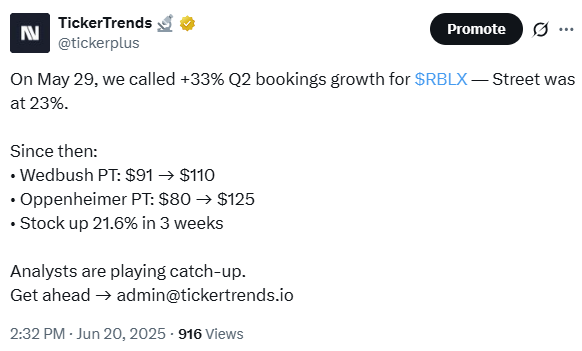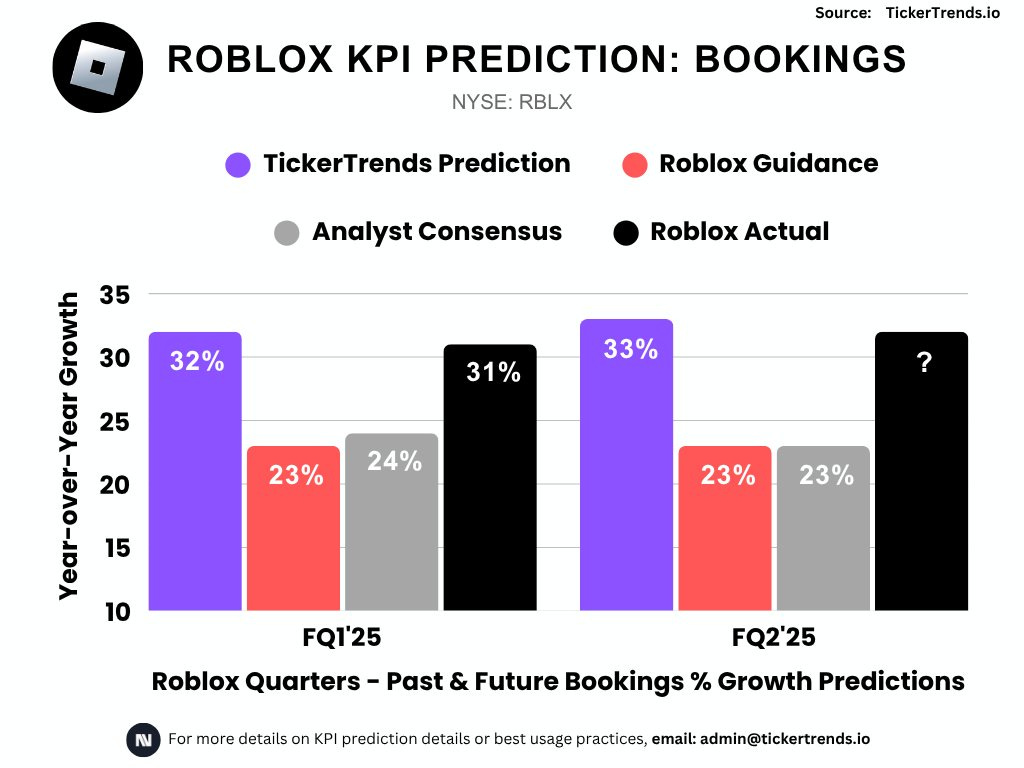 TickerTrends’ 33% YoY Roblox bookings growth forecast outpaced guidance and consensus, driven by viral custom games and early social engagement signals.