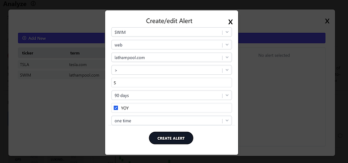 The Alerts feature is a nifty one. There’s so many other stocks to watch on a day-to-day basis and you may not have time as an investor to watch $SWIM trends everyday. Investors can simply add alerts for when the 90-day moving average of website traffic is above 5% year-over-year again and just be reminded to look at the stock again at that future date for example.