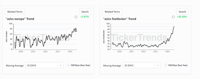 Although Footlocker has lots of Nike exposure, the downfall of Nike is ironically what is currently allowing for the sales stabilization of Footlocker revenue to date. Nike getting less popular is allowing other shoe brands to pop up and take market share. Alternative data sources like Google Trends and website traffic for brands like New Balance and Asics — the other key brands Foot Locker sells — started to show increased interest. While traditional financial analysis might have overlooked these shifts, alternative data clearly indicated that consumer demand was beginning to tilt in favor of these brands, setting the stage for Foot Locker’s turnaround.