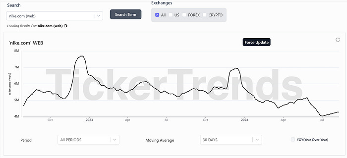 Foot Locker was long associated with Nike. It was reported that Nike at one point represented over 70% of all $FL revenue, and now although there is no exact number, is reported to be in the 50% range. Close followers of the alternative data already saw the decline in “nike.com (web)” website traffic and expected the decline of Nike as early as late 2023, when website traffic indicated a weak Christmas sales season.