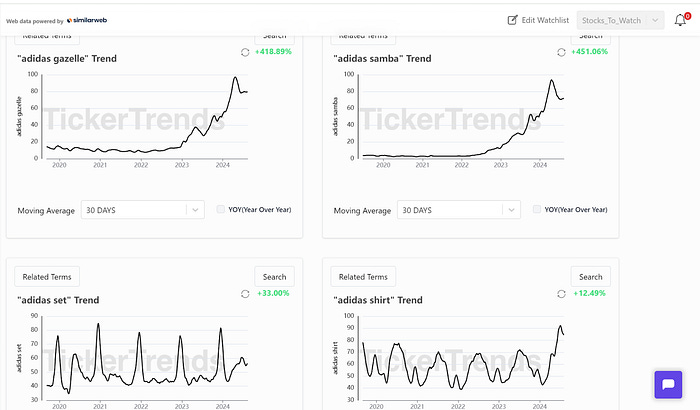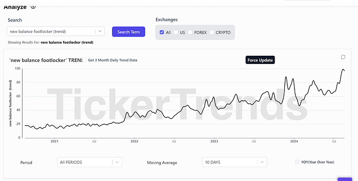 Using Exploding Trends on TickerTrends, we are able to discover some of these other brands like Asics, New Balance, and Adidas all growing rapidly.