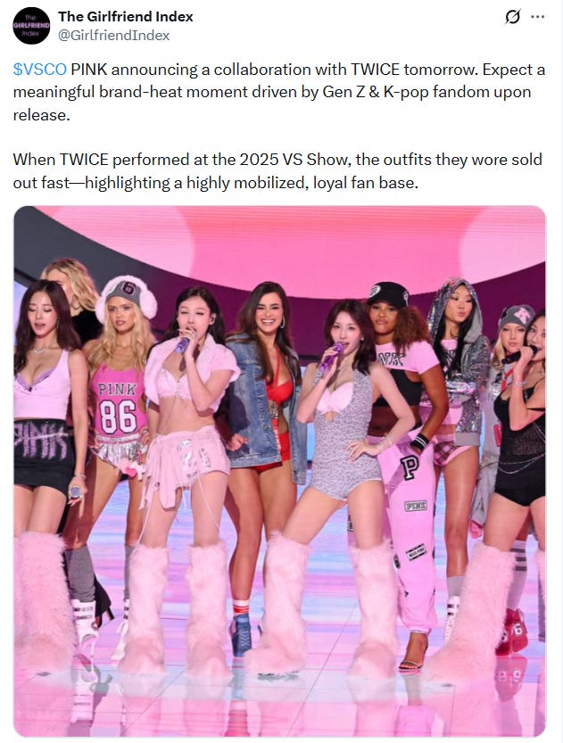 More recently, Victoria’s Secret partnered with TWICE, one of the largest global K-pop acts, as brand ambassadors. This is especially important for international relevance and younger consumers, particularly in Asia, where K-pop influence translates directly into fashion and beauty purchasing behavior.