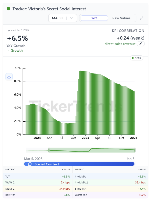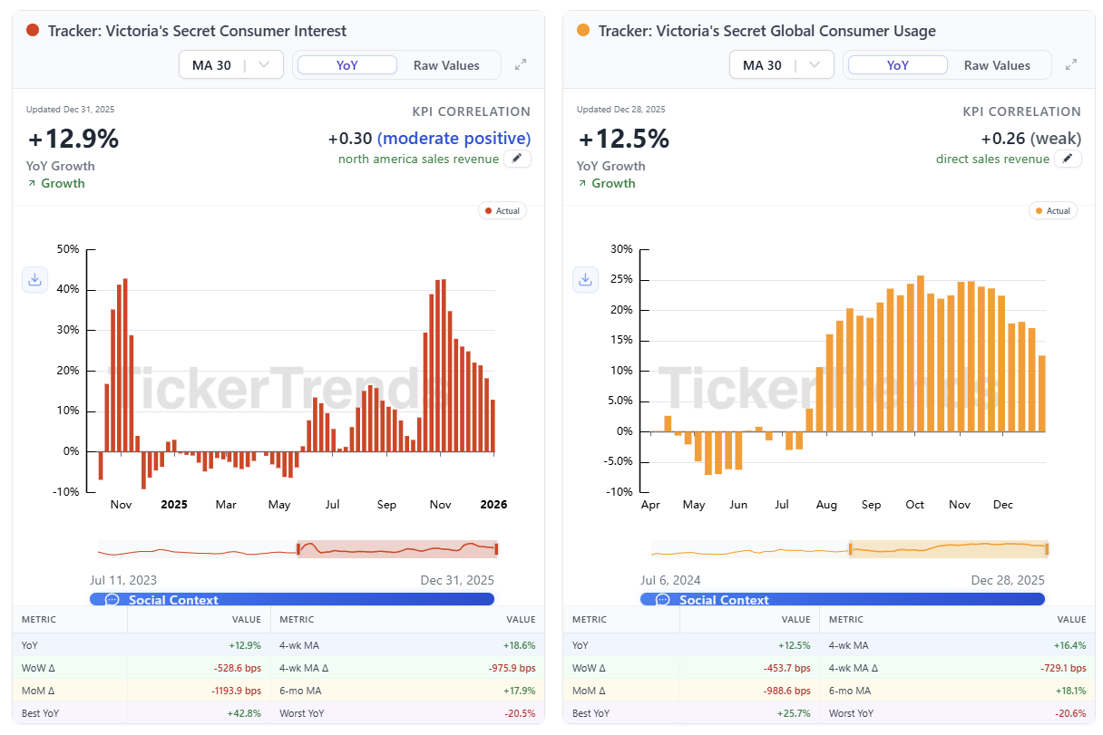 TickerTrends data shows that Victoria’s Secret Consumer Interest is still growing, but at a slower clip, currently up about 13 percent year over year. Global Consumer Usage is also positive at roughly 12 percent year over year, though the rate of acceleration has softened compared to earlier in the year.