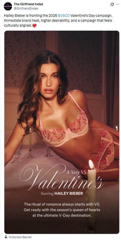 The brand has worked with Hailey Bieber through Victoria’s Secret and PINK-related campaigns, leaning into clean aesthetics, influencer credibility, and social-native content rather than legacy glamour positioning.