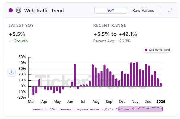 Social Interest remains positive, up mid-single digits year over year, but has gradually trended lower over recent months since the October 2025 fashion show. Website traffic tells a similar story. Traffic is still up year over year, but the slope has flattened and recent prints are closer to the low end of the recent range.