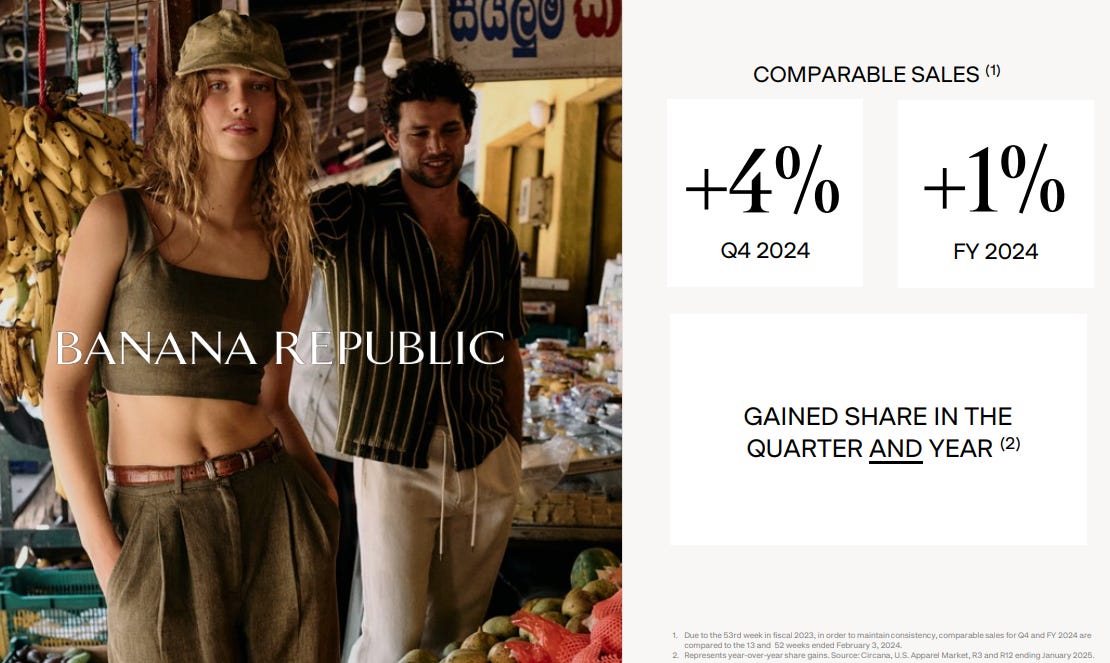 Old Navy delivered 3% comp growth in Q4, securing its position as the #1 specialty apparel brand in the U.S. The brand continued to gain market share, with strength in denim and activewear, where it became the #5 player in the U.S. and the only brand in the top five to gain share. Gap accelerated with 7% comp growth, marking its fifth consecutive quarter of positive comps and seventh consecutive quarter of market share gains. The brand is regaining cultural relevance through strategic product innovation, marketing, and collaborations.